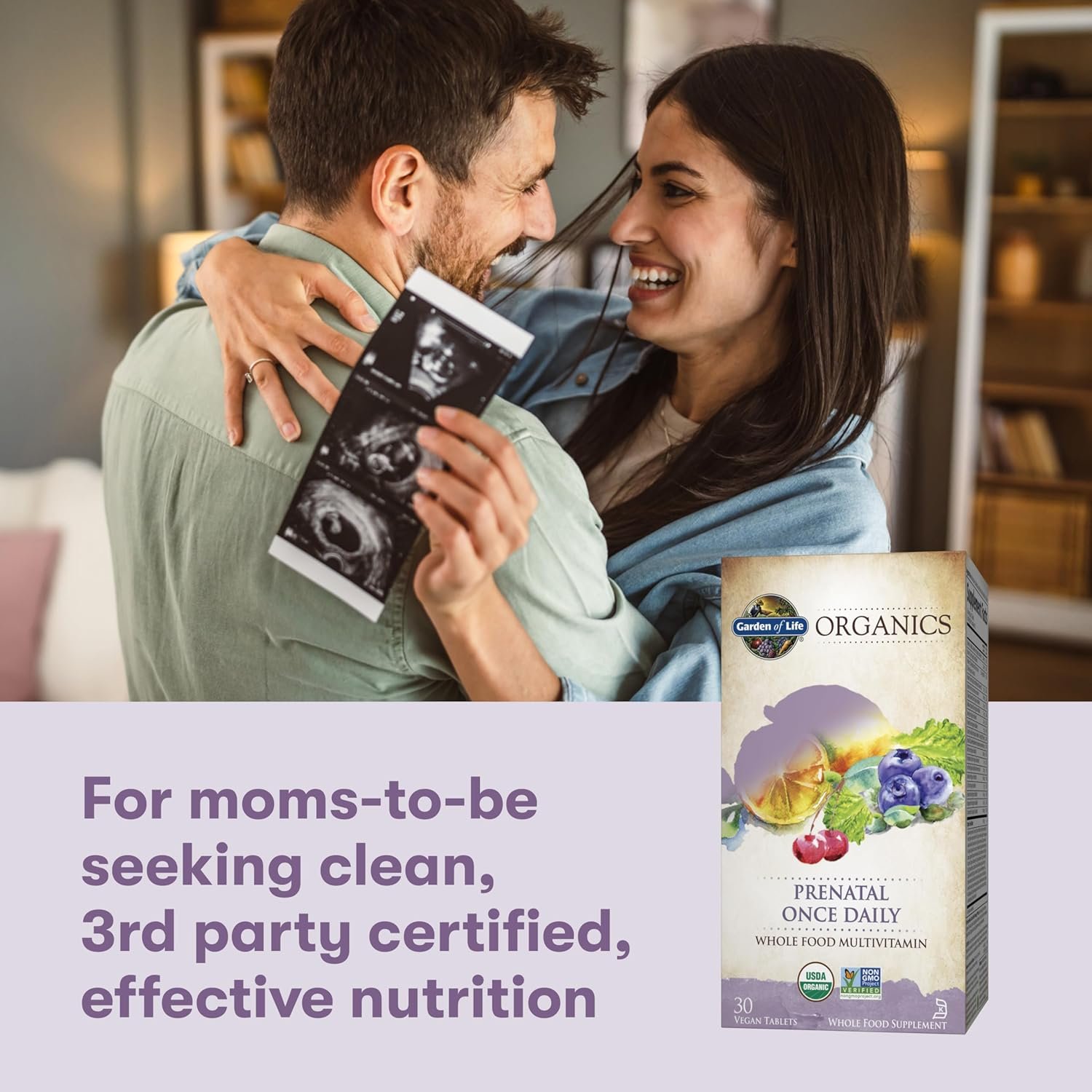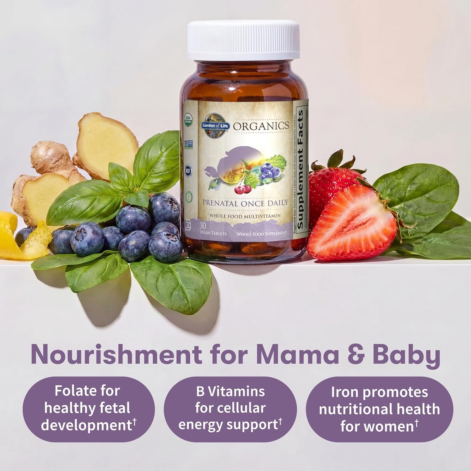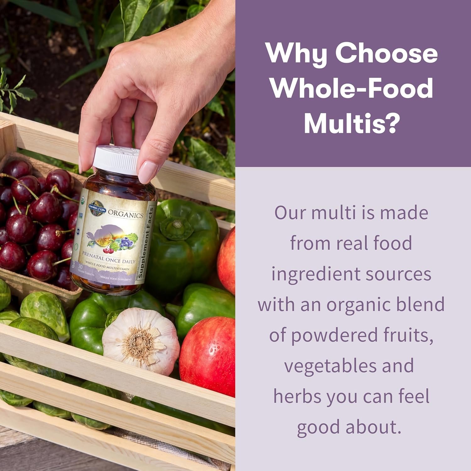 Garden of Life Organics Prenatal Once Daily Multivitamin is a Certified Organic, Non-GMO Project Verified, NSF Gluten-free, Vegan and Kosher prenatal multivitamin formula made from whole foods, free from synthetic binders and fillers. One daily tablet promotes healthy fetal development with 100% DV of Folate from Organic Lemon Peel and Vegan D3 from Lichen.† Mom also gets energy support with over 100% daily value of all B complex vitamins, including vitamins B6 and B12.† With our Clean Tablet Technology™, our tablets are easy-to-swallow and dissolve in less than 30 minutes, ensuring high bioavailability. Adults take 1 tablet daily with food.