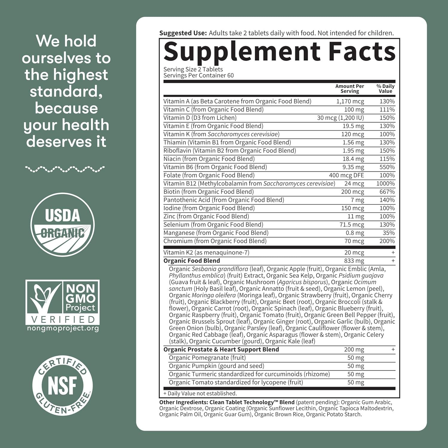 HEALTH, VITALITY & STAMINA MULTIVITAMIN SUPPLEMENT: Our Vegan multivitamin for men over 40 promotes health and well-being, including prostate, vision and heart support―made from over 30 nutritious and Organic fruits, vegetables & herbs