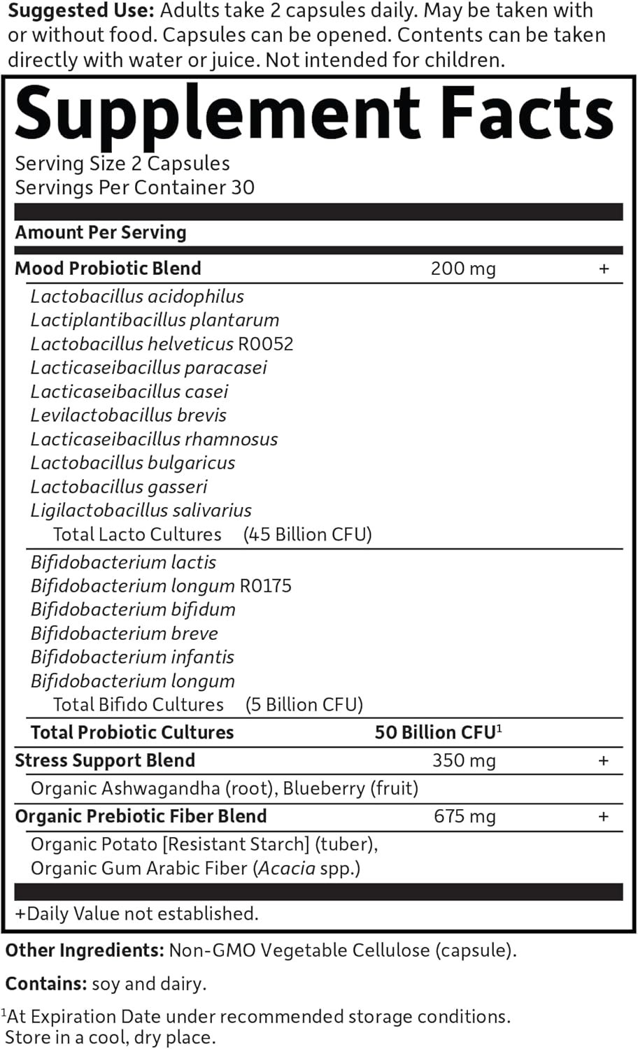DIGESTION SUPPORT: Emerging science shows a link between gut & brain health; this supplement includes L. helveticus ROO52 & B. longum RO175—Clinically shown to support mood and relaxation—plus Lactobacillus acidophilus probiotics for digestive health*