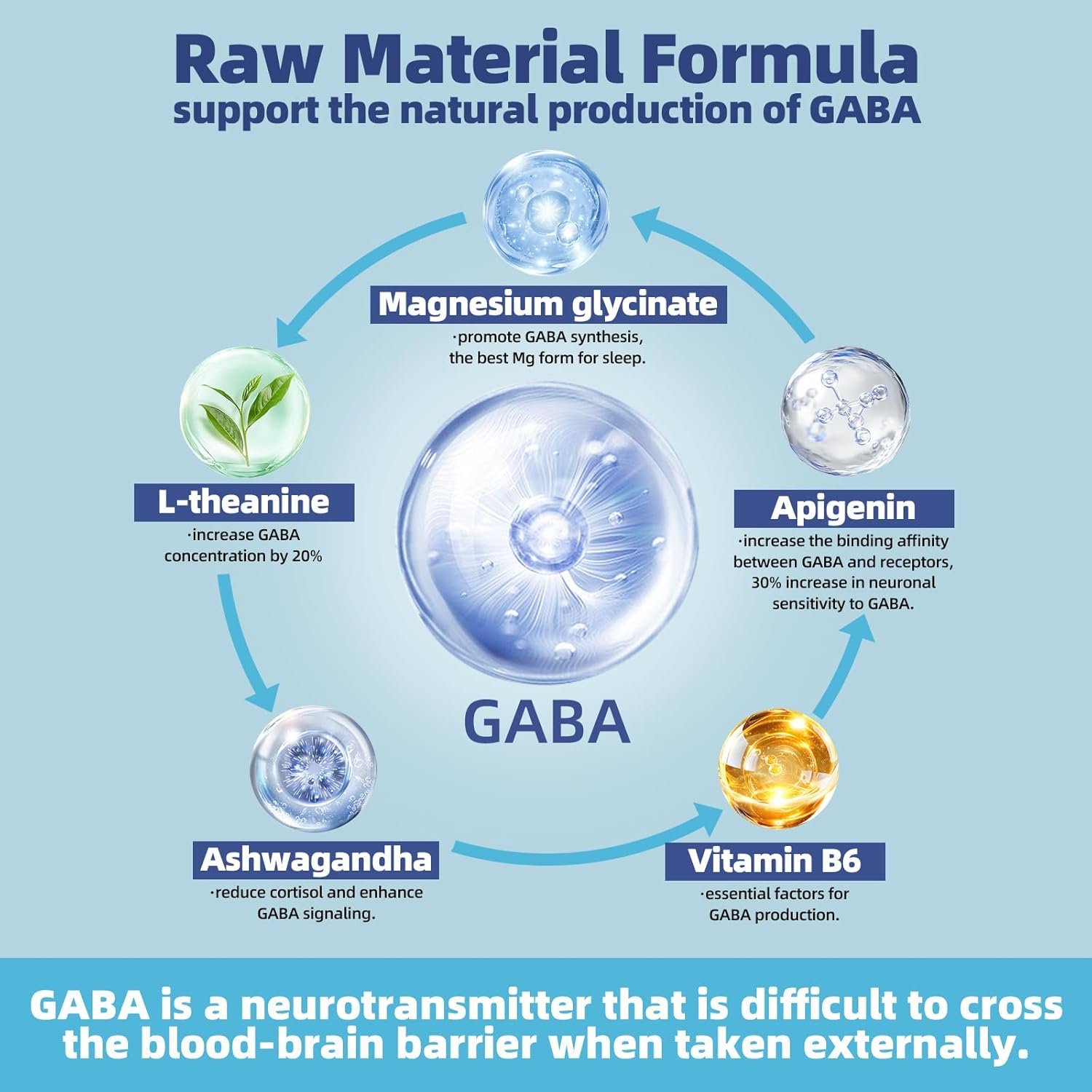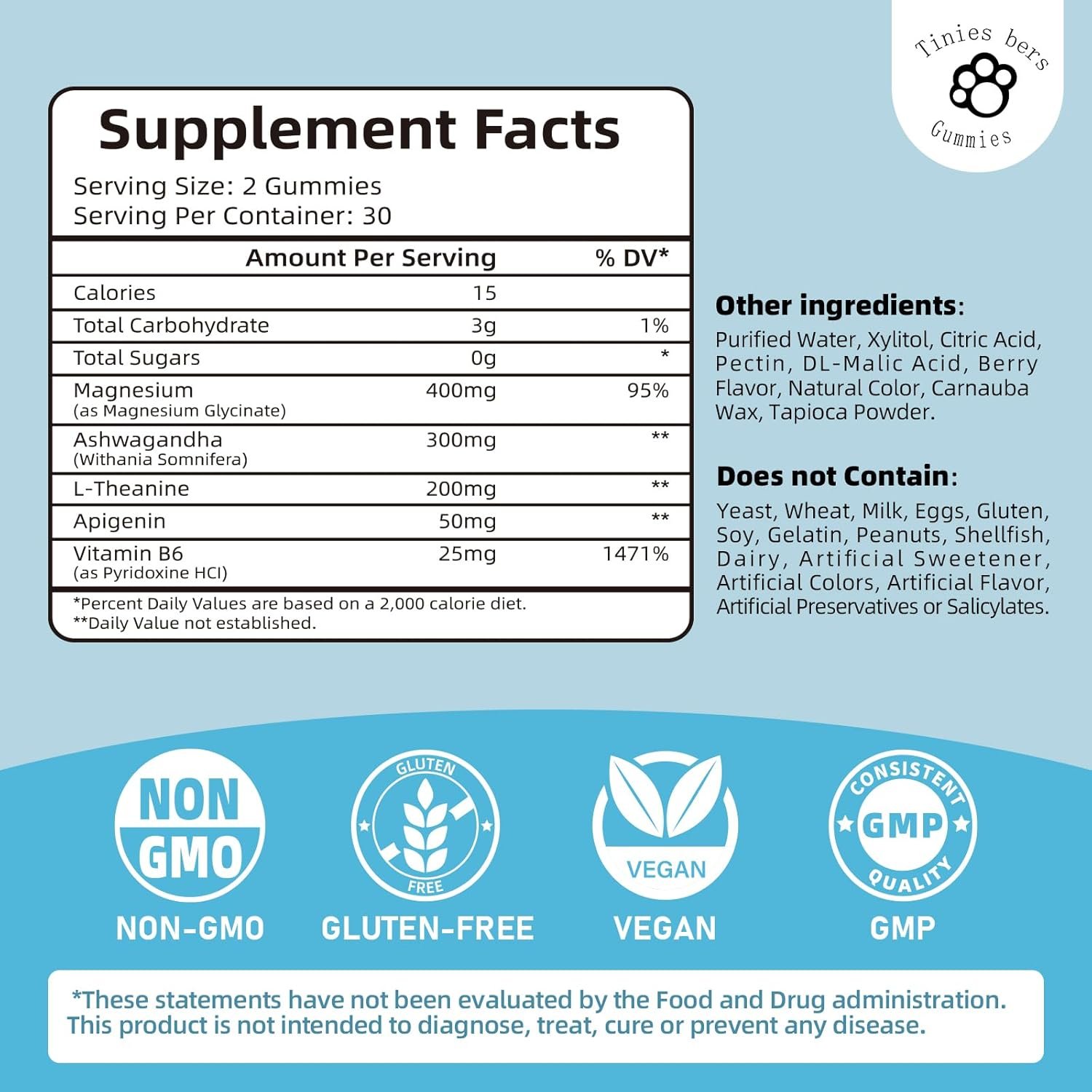 Tinies bers L theanine Gummies: 5-in-1 l-theanine gummies, per serving contains theanine 200mg, magnesium glycinate 400mg, ashwagandha 300mg, apigenin 50mg, and vitamin B6 25mg. NO GABA or melatonin. GABA, as a neurotransmitter, can HARDLY cross the brain barrier after exogenous intake.