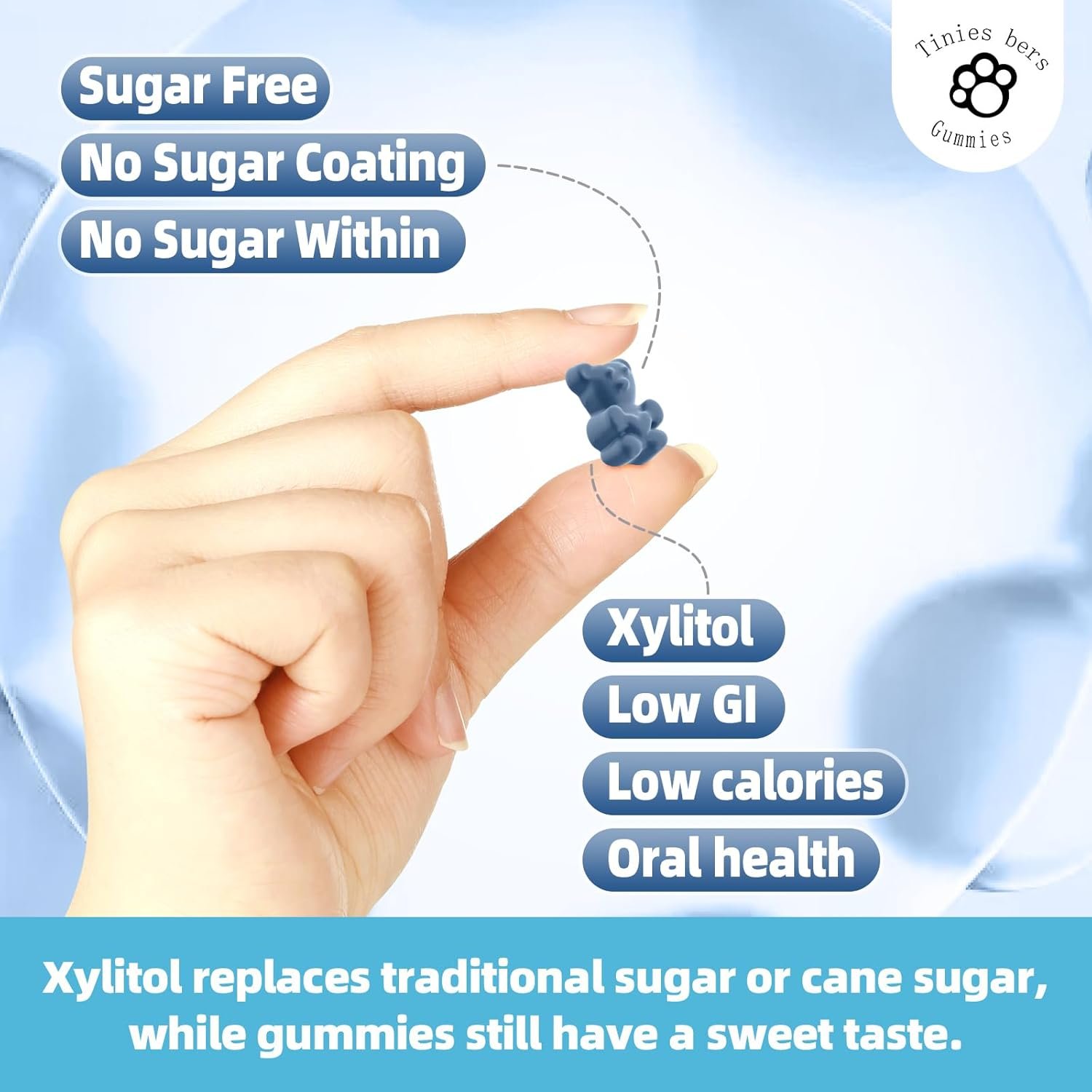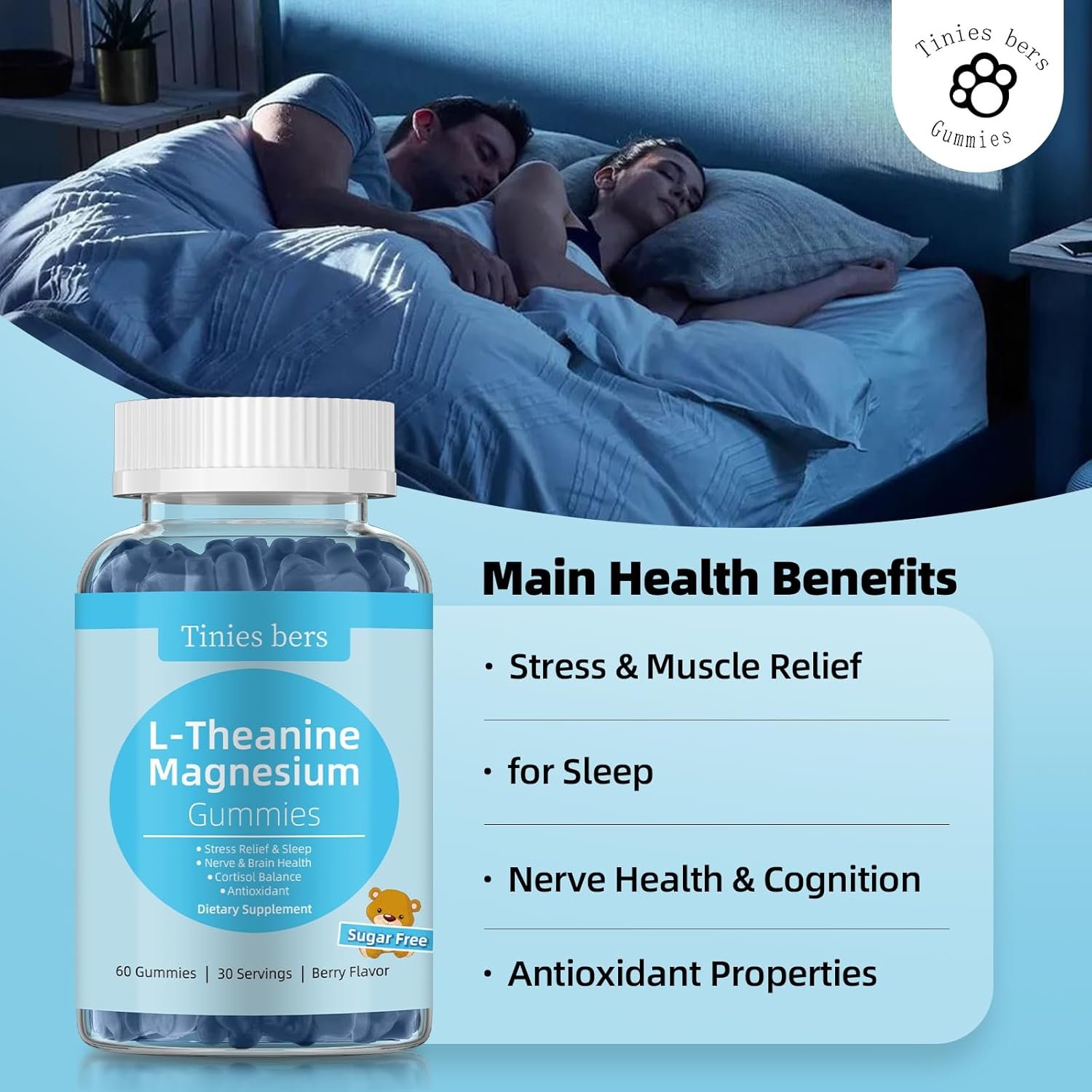 Sugar Free Gummies: All gummies supplements offered by Tinies bers are sugar free (no sugar or cane sugar), no sugar coating and no sugar within. The added xylitol replaces traditional sugar, giving magnesium glycinate l theanine gummy a sweet taste too.