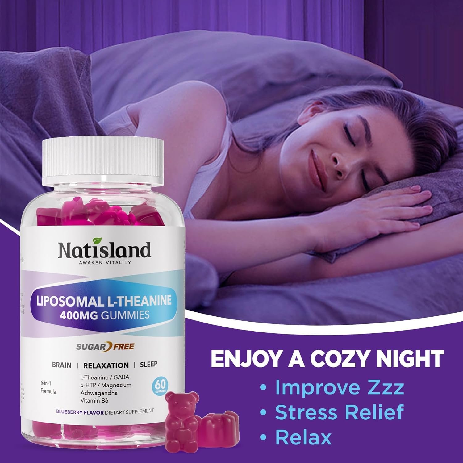 6-In-1 Blend Formula: L’theanine, sourced from natural green tea leaves, is well-known for promoting relaxation and focus. Our l-theanine 400mg gummies are combined with gaba 200mg, 5-htp 50mg, ashwagandha 150mg, magnesium glycinate 200mg, and vitamin b6 3.4mg