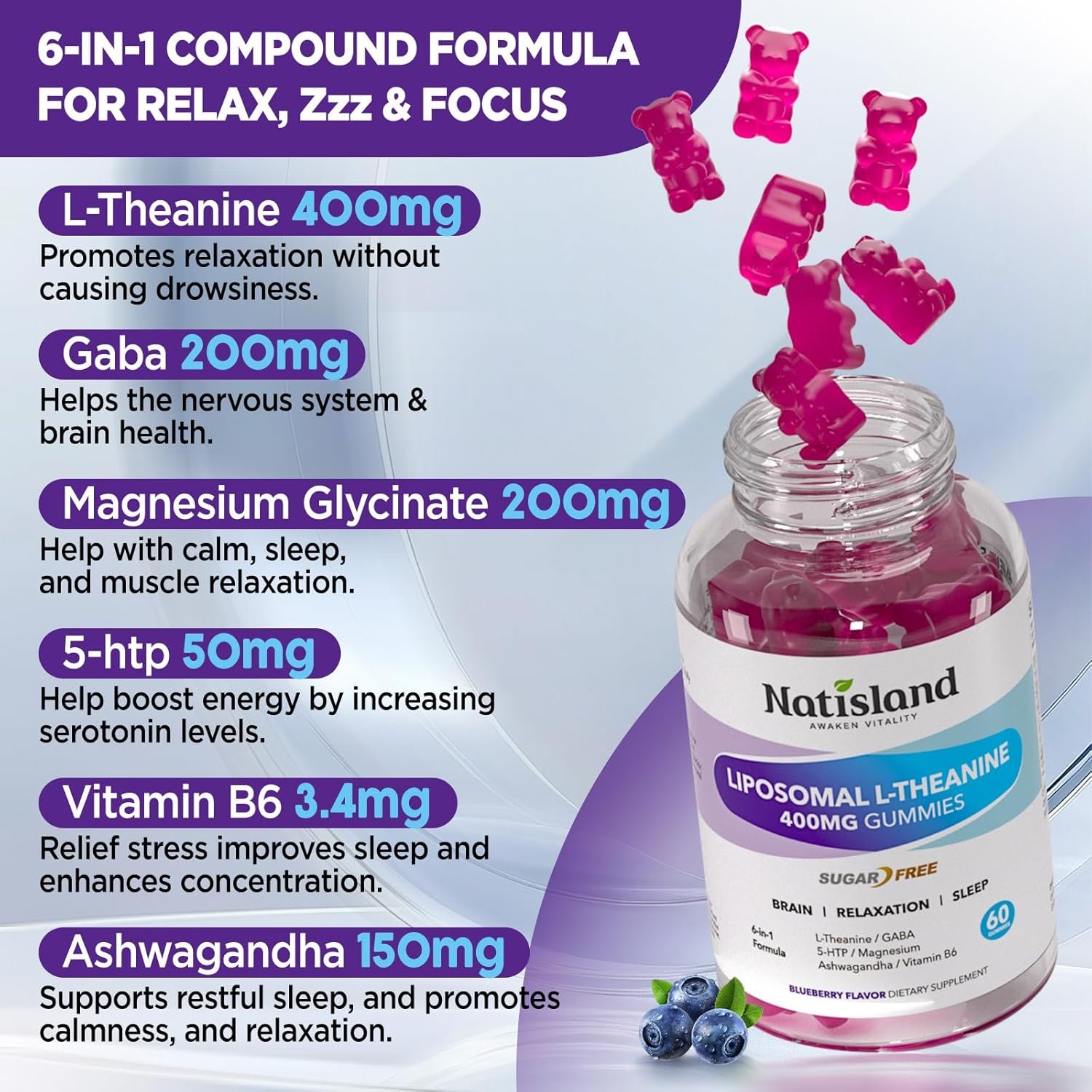 Natural Ingredients & Safety: Natural blueberry flavor that suits both adults and kids! Our organic l-theanine chewable supplement is made from natural ingredients. Vegan, pectin-based, non-GMO, and gluten-free. Each bottle contains 60 l theanine gummies, 1 month’s supply