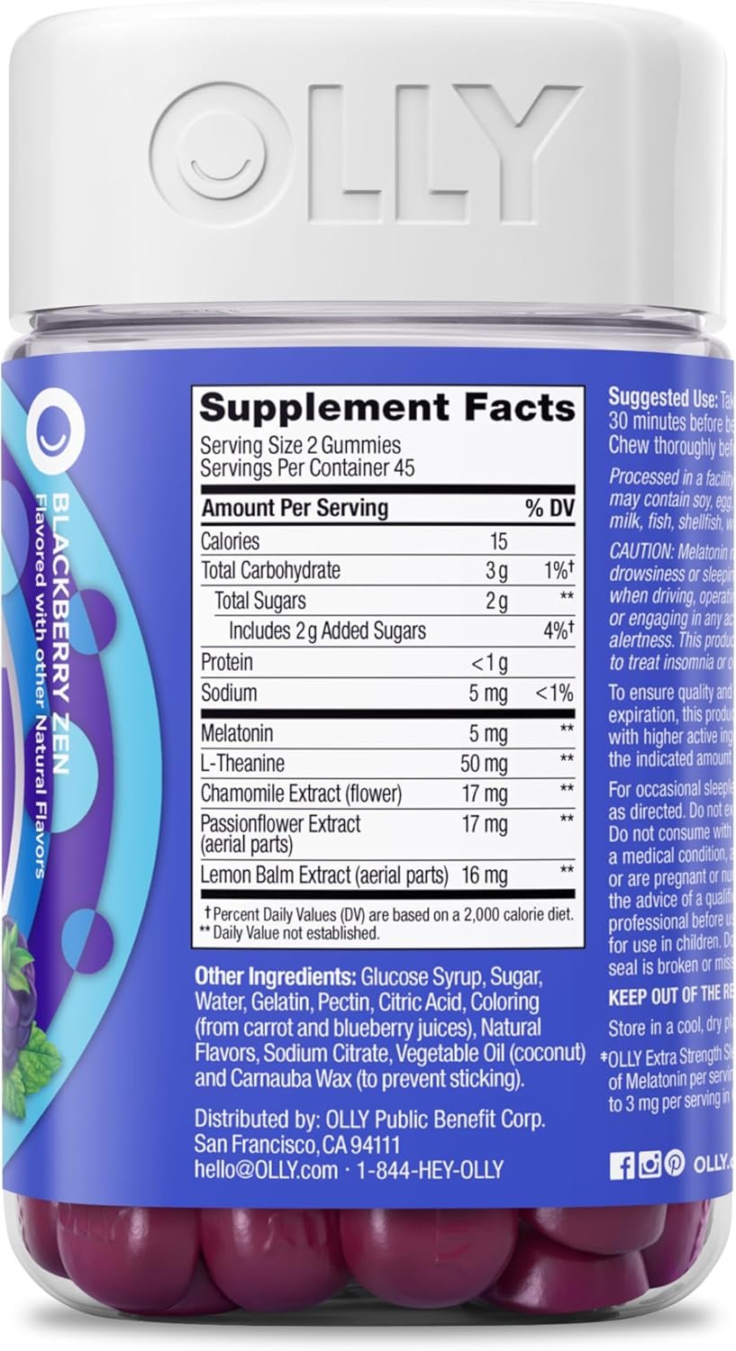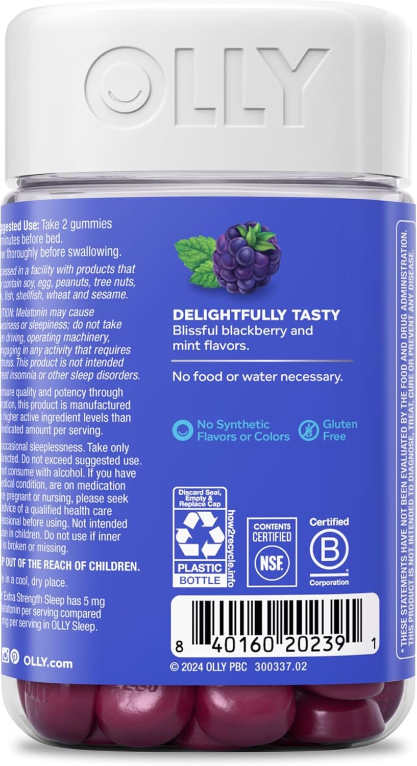 OLLY Extra Strength Sleep gummies for adults deliver a delightful blend of active ingredients that work together to promote restful sleep so you wake up feeling refreshed. These 5mg Melatonin gummies, with L-Theanine to work with your body to help you fall asleep and stay asleep.* Includes traditional Botanical Extracts like Chamomile and Lemon Balm. Deliciously flavored with Blackberry and a hint of mint with other natural flavors, these Sleep gummy supplements help you drift off. They’re delightfully tasty, scientifically formulated and gluten-free. *These statements have not been evaluated by the Food and Drug Administration. This product is not intended to diagnose, treat, cure or prevent any disease. For occasional sleeplessness. CAUTION: Melatonin may cause drowsiness or sleepiness; do not take while driving, operating machinery, or engaging in any activity that requires alertness. This product is not intended to treat insomnia or other sleep disorders.