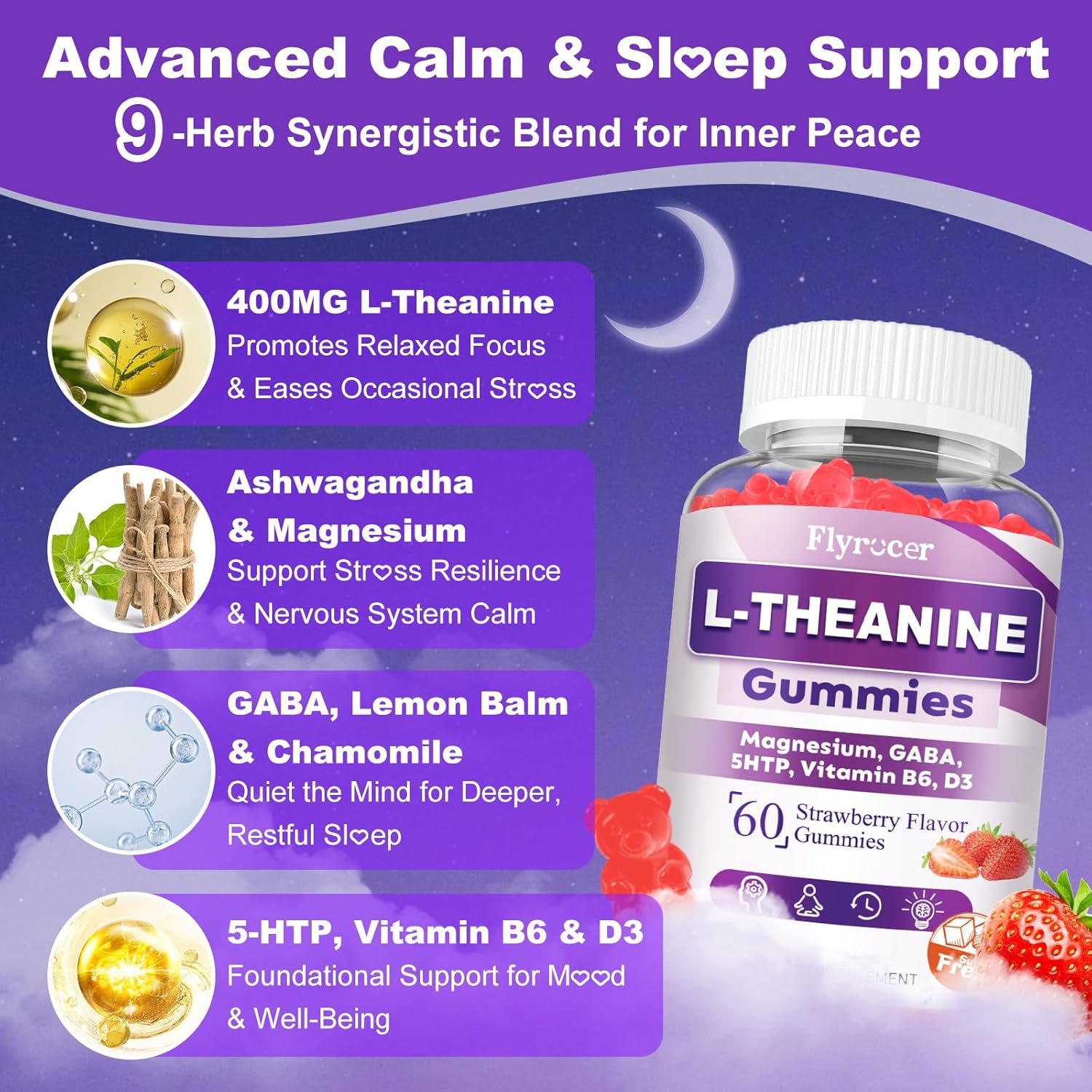 Great for Relaxation and Overall Wellness! I’ve been using the Flyroce L-Theanine Gummies for a couple of weeks now, and I’m really impressed with the results. These gummies are a game-changer for anyone looking to reduce stress and improve mental clarity. Here's why I love them:Relaxation & Calmness: The combination of L-Theanine (400mg per serving), Ashwagandha, and GABA is fantastic for promoting relaxation without feeling drowsy. I’ve noticed a significant decrease in my anxiety levels, and my overall mood has been much more stable throughout the day.Better Sleep & Focus: The added Magnesium Glycinate (200mg) has definitely helped with sleep quality, and the inclusion of Vitamin D3 and B6 supports my overall energy levels. I wake up feeling more rested and focused.Natural Ingredients: I really appreciate the natural ingredients like Lemon Balm Extract, Chamomile Extract, and 5HTP, all of which contribute to a calm mind and help me feel centered, especially during stressful moments.Taste & Convenience: These gummies are easy to take, and the strawberry flavor is delicious! Plus, they’re vegan, non-GMO, and sugar-free—perfect for my dietary preferences.Overall, these gummies have made a noticeable difference in my daily routine. They’re a must-try for anyone looking to boost their mental clarity, manage stress, and improve sleep. Reasonable value for the price compared to similar products.