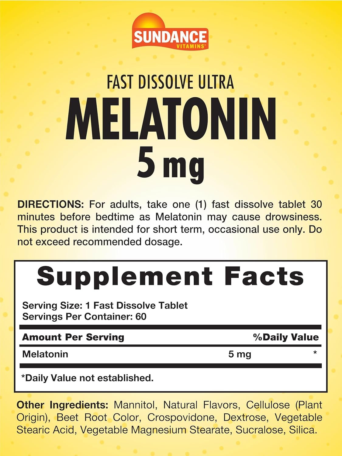 Sundance Vitamins Fast Dissolve Ultra Melatonin delivers 5 mg of Melatonin to help you settle down and prepare for your nightly routine. These delicious natural berry flavored fast dissolvable tablets melt right under your tongue – a great alternative to swallowing pills and more convenient than a liquid.
